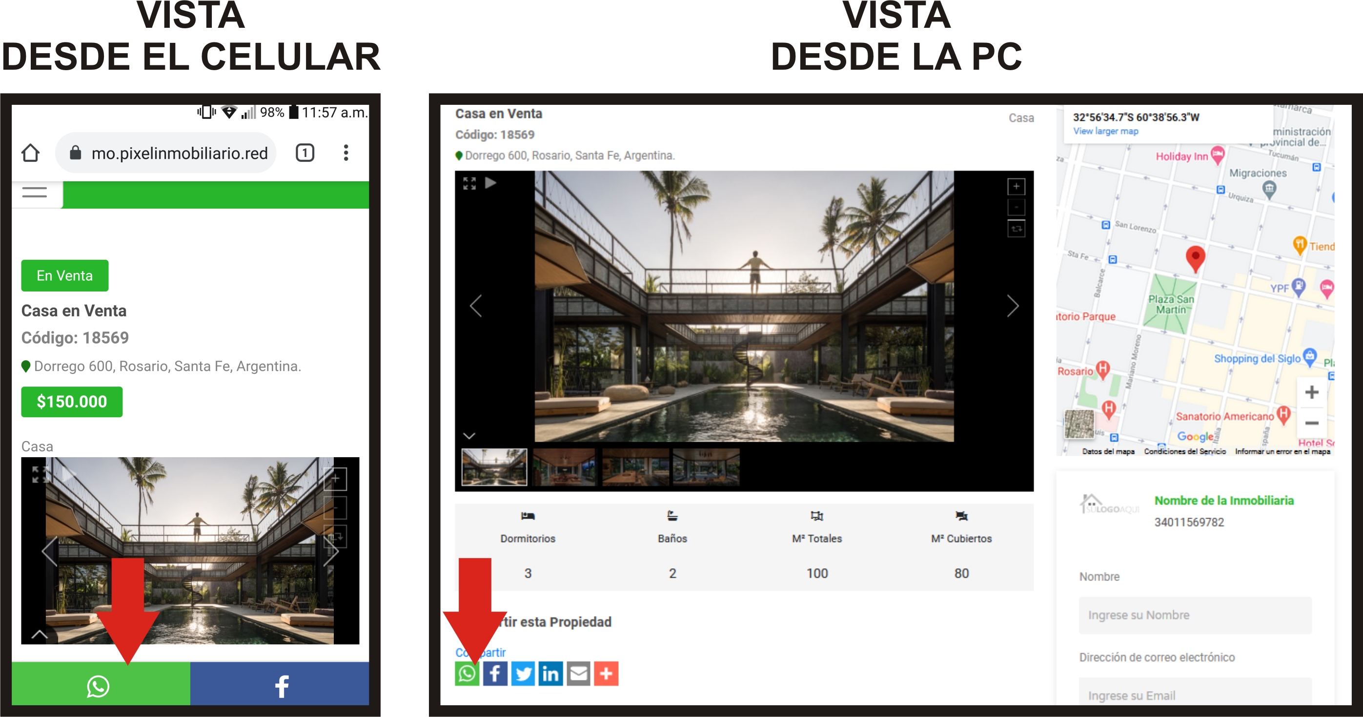 Para enviar las fichas de sus propiedades por WhatsApp, solo es necesario que tengan su web inmobiliaria desarrollada por Pixel Inmobiliario.